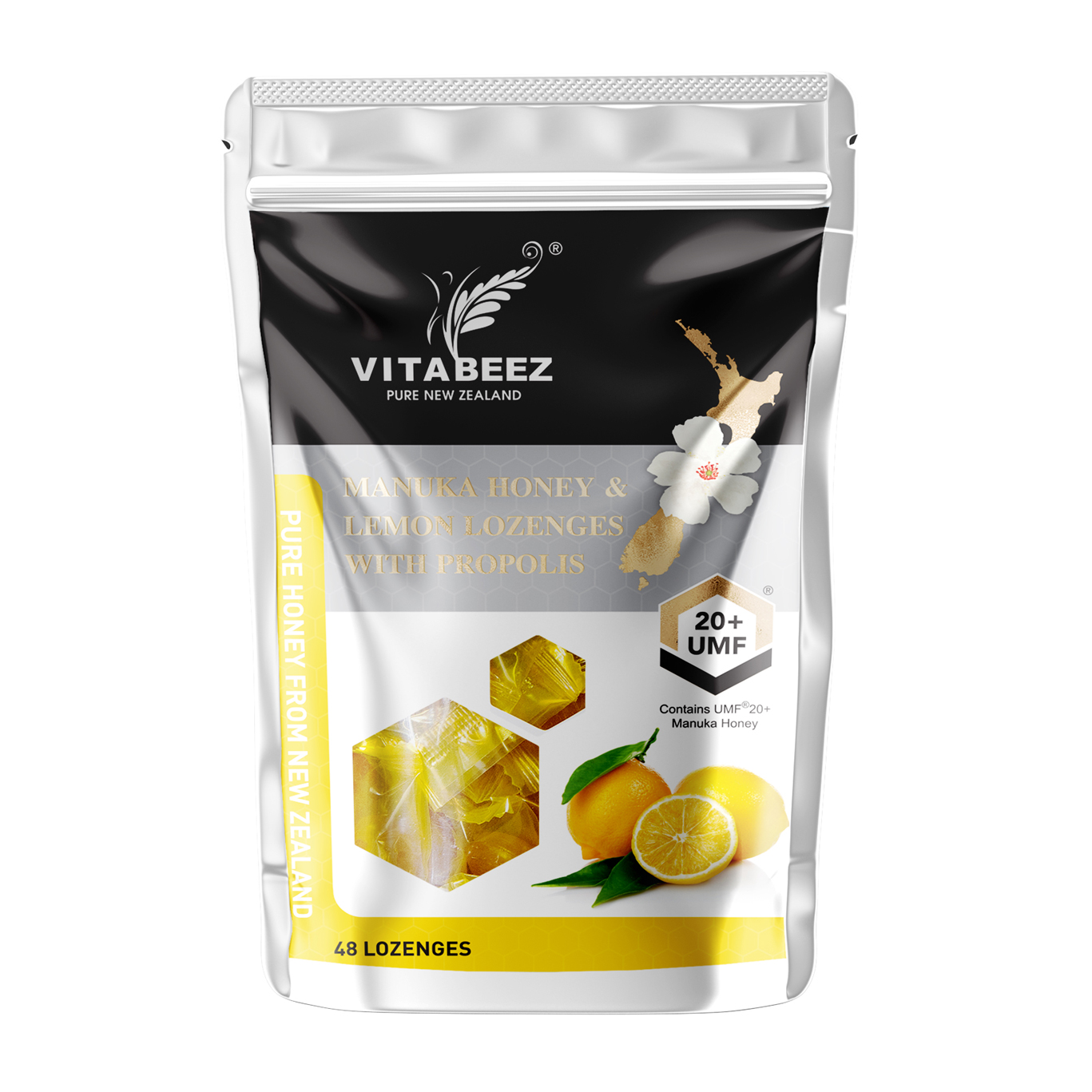 Vitabeez’s Manuka Honey and Lemon Lozenges with Propolis contains the UMF® 20+ manuka honey from the remote manuka bush valleys in New Zealand. UMF Manuka honey has been recognized worldwide for its unique manuka factor.